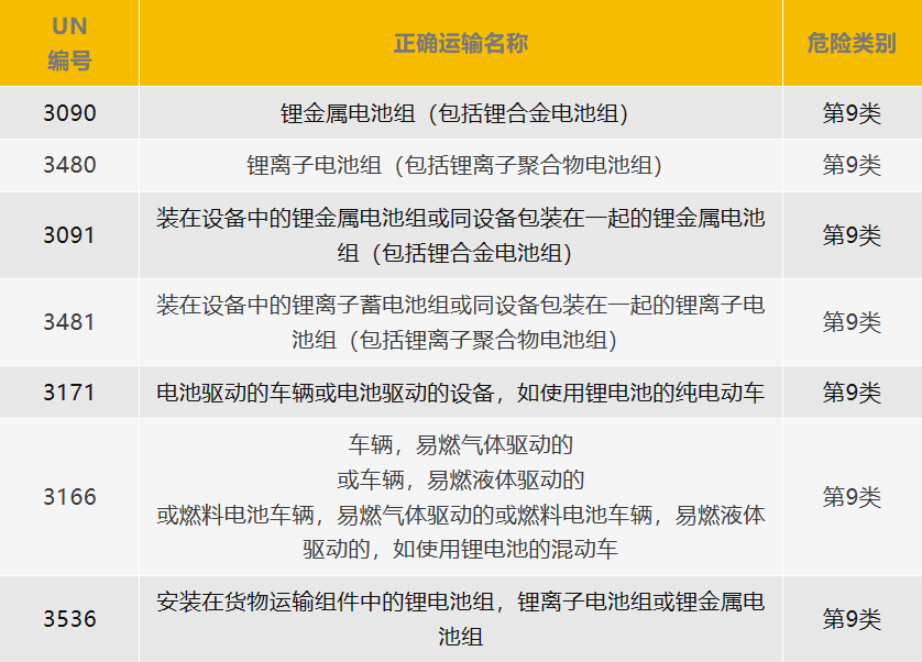 一|鋰電池運輸的分類 根據《國際海運危險貨物規則》對危險貨物的分類,鋰電池屬于9類雜項危險貨物之一。 在運輸方面,鋰電池又被細分為單獨運輸的鋰電池、與設備一起運輸的鋰電池、含有鋰電池的車輛和裝在貨運裝置中的鋰電池四大類。 從產品類型的角度,上述四大類則再次細分為7個條目,我們通過對應的UN編號,可以區分鋰電池貨物在運輸中的不同產品類型。